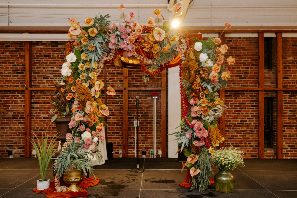 Their approach: Florals were not an accent. They were the moment. Sculptural installations, flowers suspended from the ceiling, and citrus woven into arrangements made the florals feel alive and immersive.