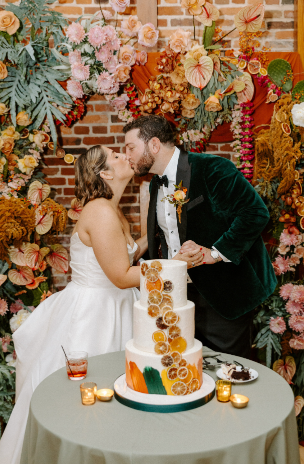 Their approach: Nothing was random. From the custom watercolor of Baltimore in the invitation envelope liner to disco balls tucked into florals to dried citrus on the cake, every detail spoke the same visual language.