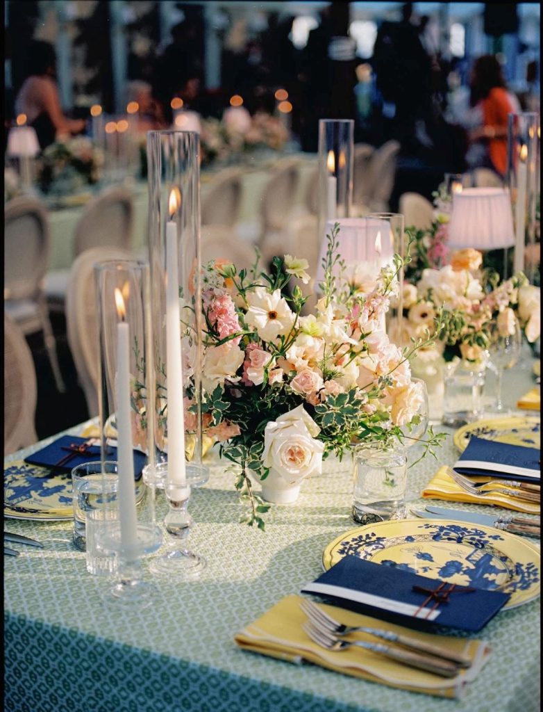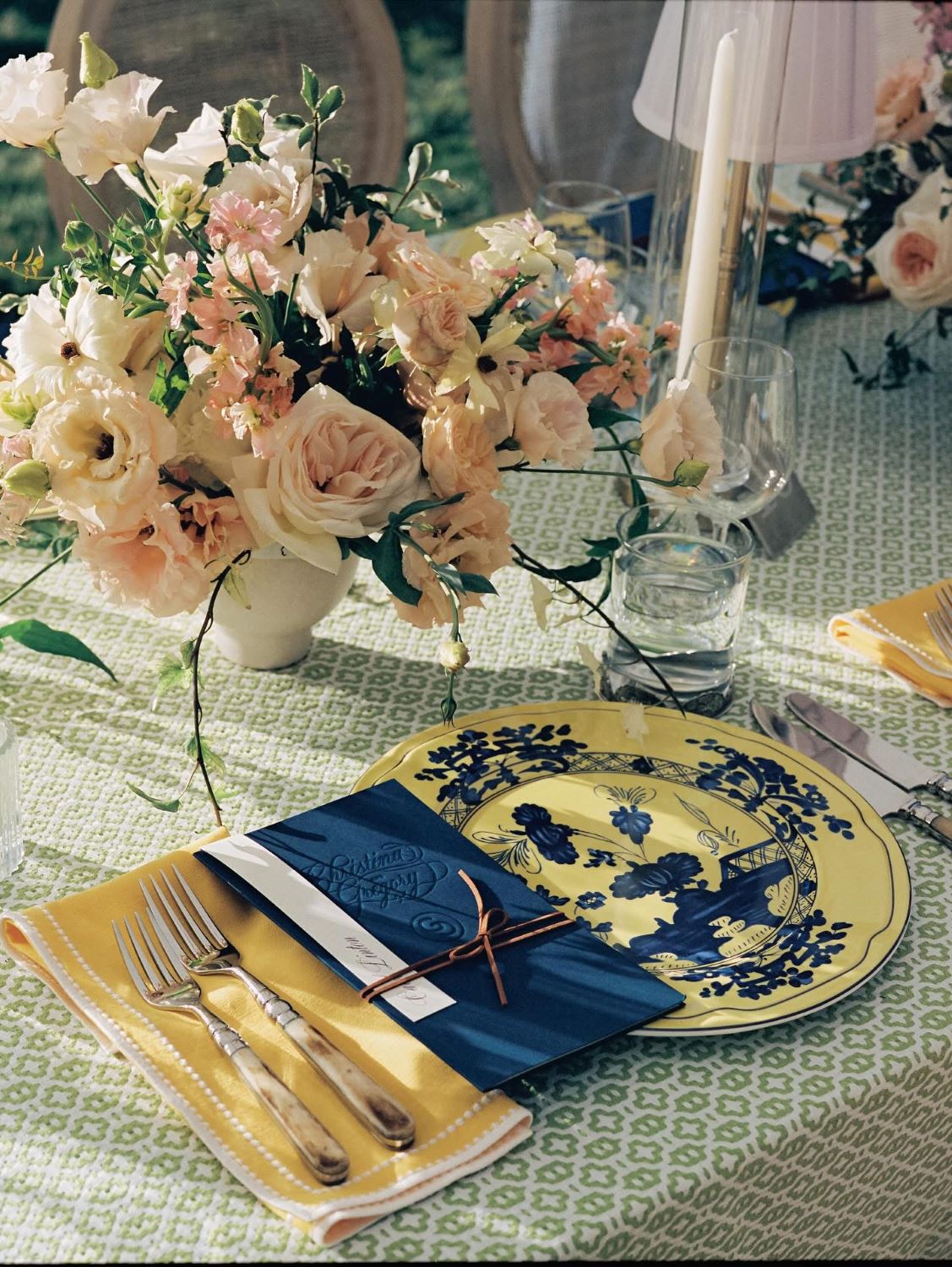 But their reception? Forest green linens, yellow napkins, patterned tablecloths in a geometric sage print, navy blue place settings on yellow charger plates with blue-and-white toile china stacked on top. Blush centerpieces in white ceramic urns. It was layered — confident and collected, not matchy-matchy.