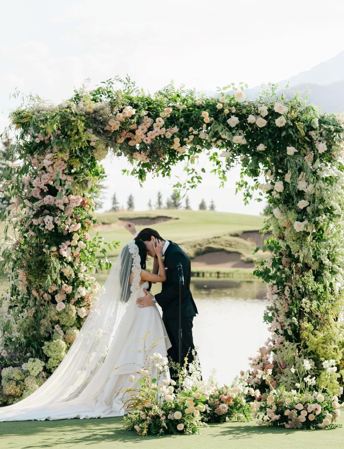 When most people picture a Jackson Hole wedding, they picture blush and ivory. Soft. Airy. Safe. Christina and Gregory did something smarter. Their ceremony palette was the expected blush — creamy roses, soft garden blooms, all that lush greenery cascading down the arch in every direction.