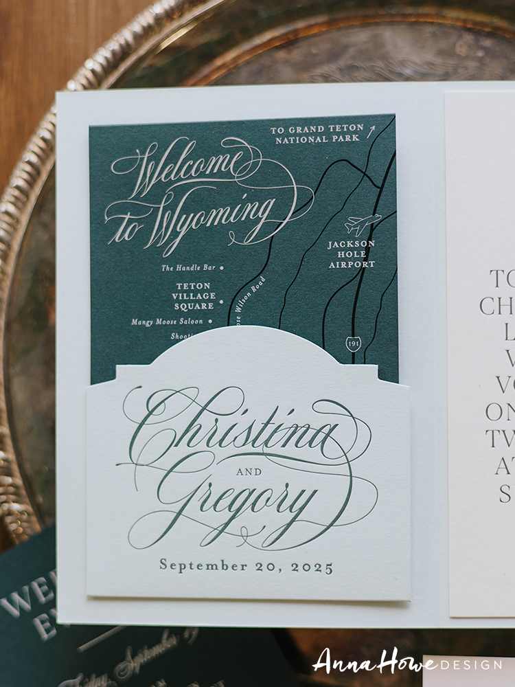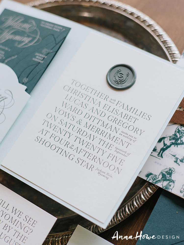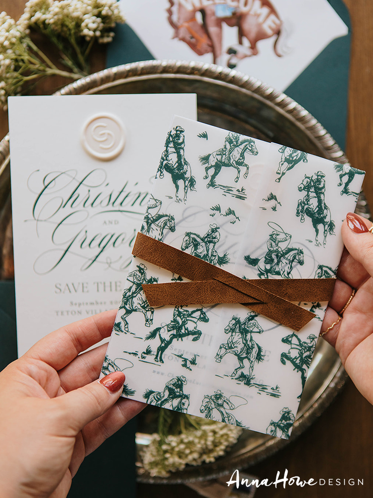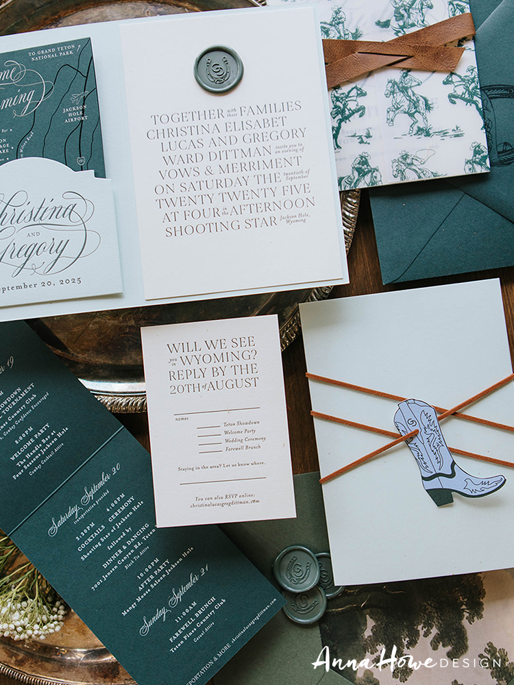 The suite we designed for them opened with an invitation printed in deep forest green and cream — bold serif typography mixed with flowing script, a horseshoe wax seal, and the wording “..an evening of vows & merriment” (which, honestly, tells you everything). Tucked inside: a hand-illustrated “Welcome to Wyoming” map card pointing guests toward the Handle Bar, Teton Village Square, and the Mangy Moose Saloon. The save the date was wrapped in a cowboy toile vellum band tied with a strip of actual leather and finished with a die-cut cowboy boot charm.