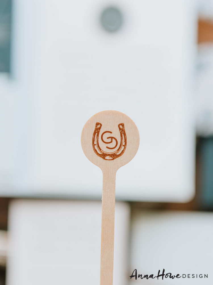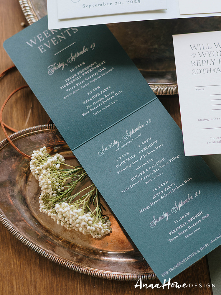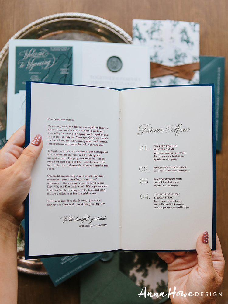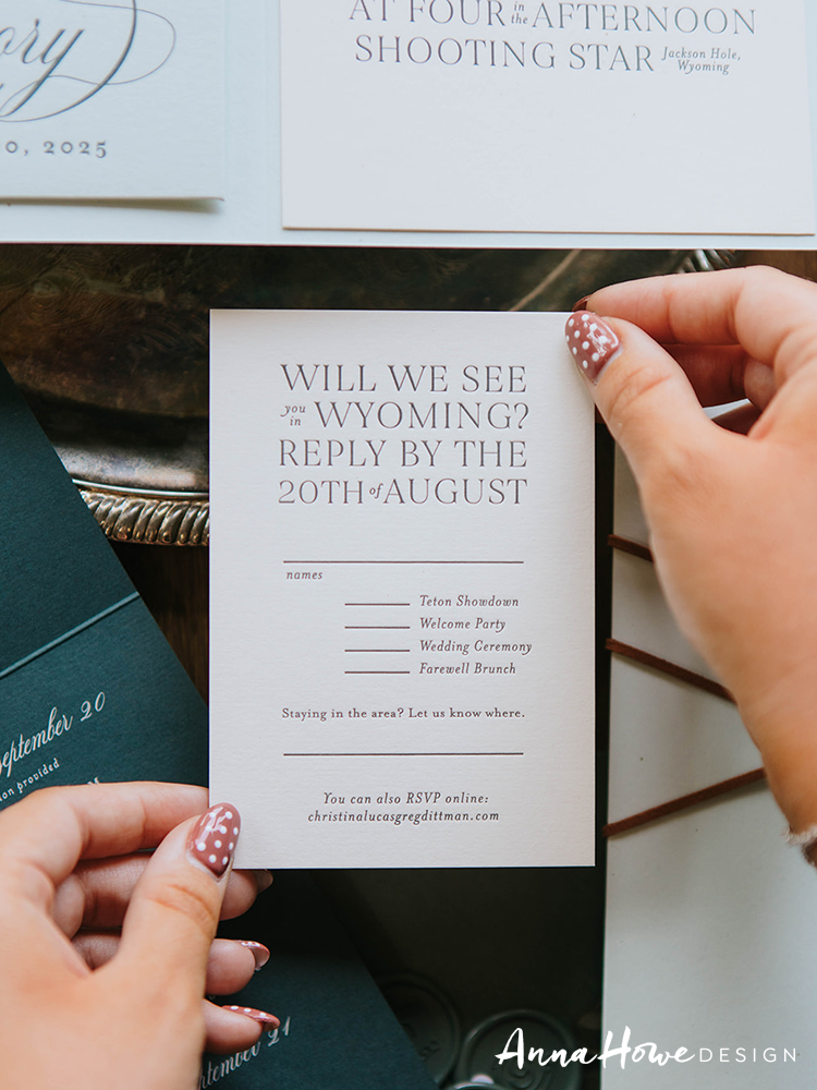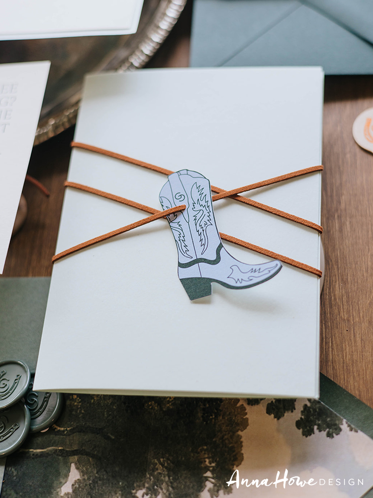 The suite we designed for them opened with an invitation printed in deep forest green and cream — bold serif typography mixed with flowing script, a horseshoe wax seal, and the wording “..an evening of vows & merriment” (which, honestly, tells you everything). Tucked inside: a hand-illustrated “Welcome to Wyoming” map card pointing guests toward the Handle Bar, Teton Village Square, and the Mangy Moose Saloon. The save the date was wrapped in a cowboy toile vellum band tied with a strip of actual leather and finished with a die-cut cowboy boot charm.