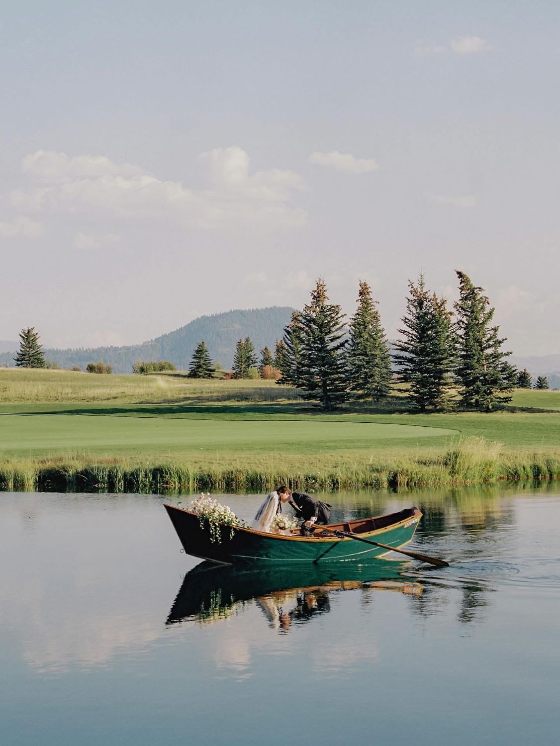 After the ceremony, while guests moved to cocktail hour, the two of them slipped into a deep green wooden drift boat filled with flowers — the veil floating, the bouquet trailing over the bow, the Wyoming mountains reflected in the still water below them. The whole scene looked like it was painted.
