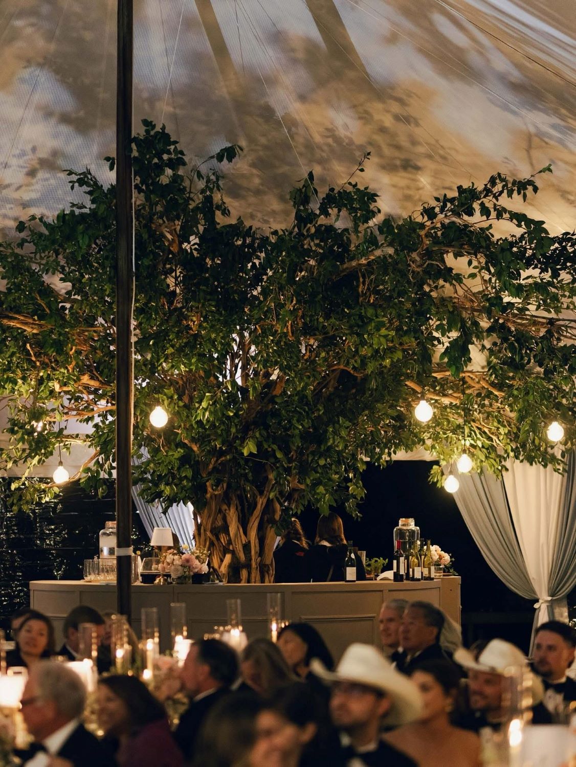They didn’t bring in centerpieces. They brought in trees. Full, living ficus trees anchored at the center of the tent, their canopies spreading over the bar and the dance floor, globe Edison bulbs hanging from the branches like fireflies. The tent walls were draped in soft fabric. Candlelight everywhere. The effect was that you weren’t sitting inside — you were sitting outside, but better.