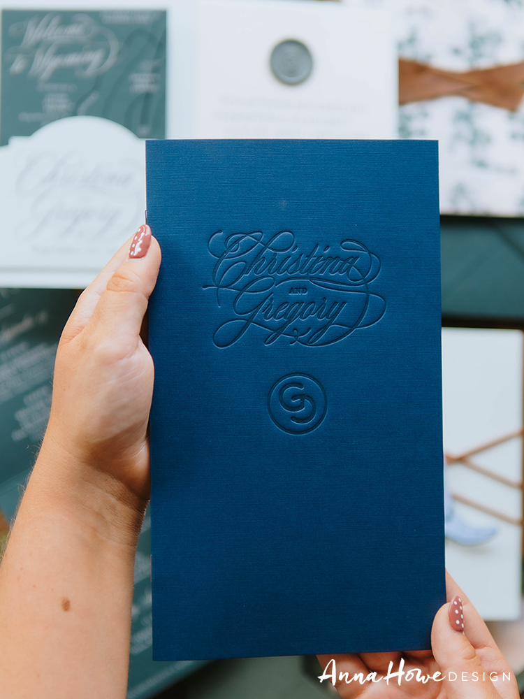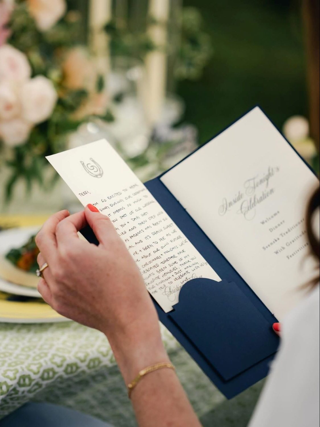 Tucked inside each guest’s navy program booklet was a handwritten personal letter from the couple — a note specifically to that guest, telling them what their presence meant. The program itself was a deep navy folder with Christina and Gregory’s names blind-embossed on the cover in flowing script. Guests opened it and found not just an order of events, but something that felt like a gift.