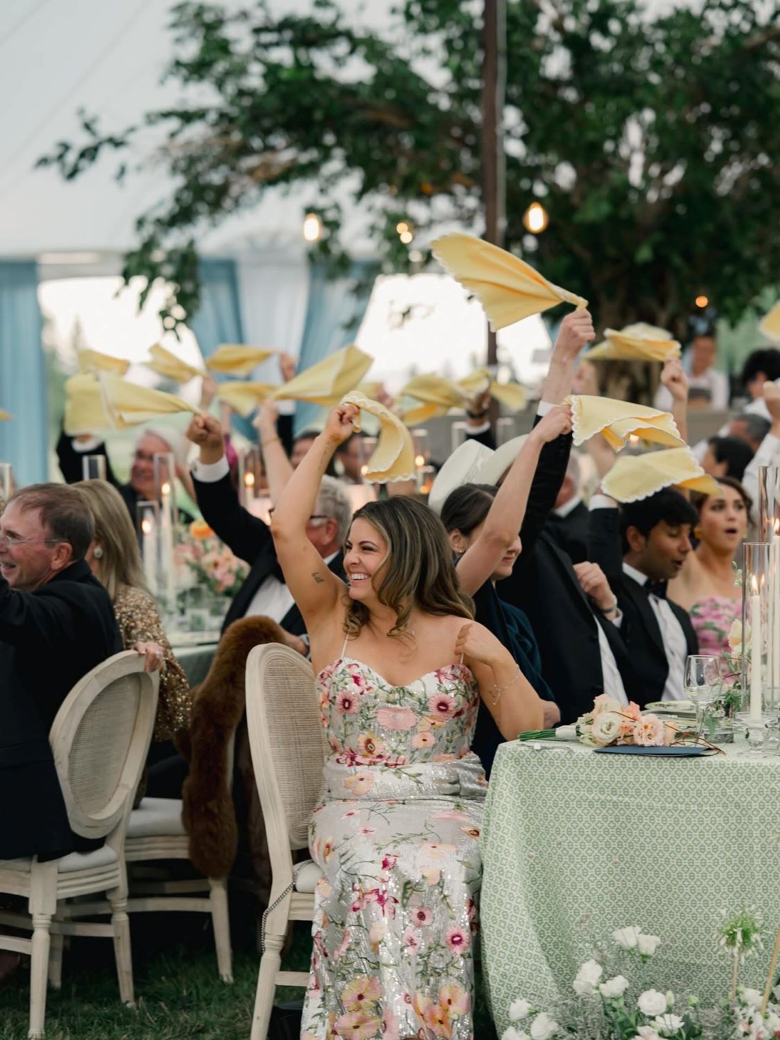 And then the moment where the whole room started waving their yellow napkins in the air during a Swedish tradition Christina’s family brought to the day — that was the tree canopy above them, candlelight all around, pure joy. That photo exists because the environment made it possible.