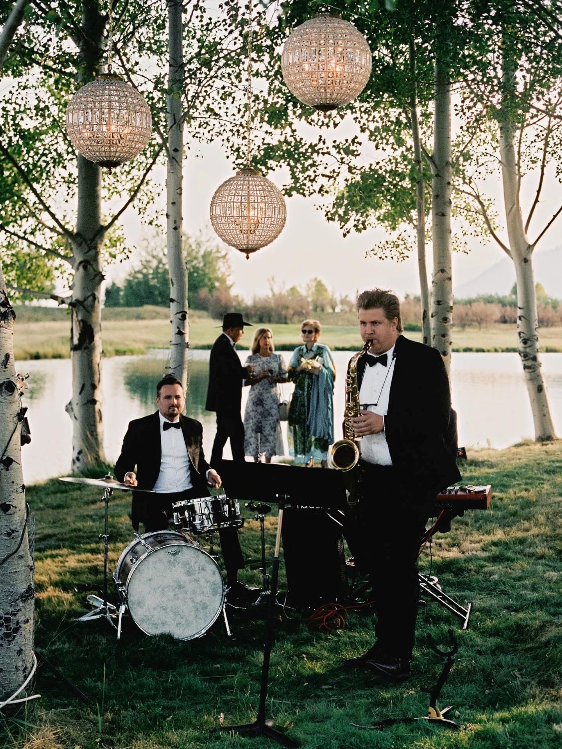 A jazz duo set up under a grove of aspen trees, crystal globe chandeliers hanging from the branches above them, the lake shimmering in the golden hour light behind the guests as they mingled. No tent, no structure, no room. Just the Wyoming land doing what Wyoming land does — being breathtaking — with two small additions: music and light.